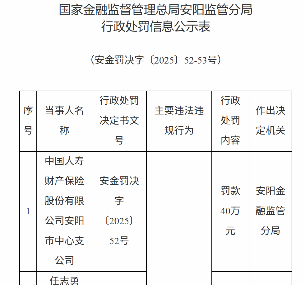 10月15日,国家金融监督管理总局安阳监管分局行政处罚信息公示表显示,中国人寿财产保险股份有限公司安阳市中心支公司因农业保险财务业务数据不真实、农业保险承保理赔资料不真实不完整被罚款40万元,任某勇警告并罚款5万元。
